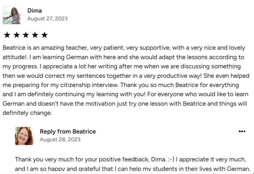 As an online native German teacher, I’ve helped hundreds of learners achieve measurable results: